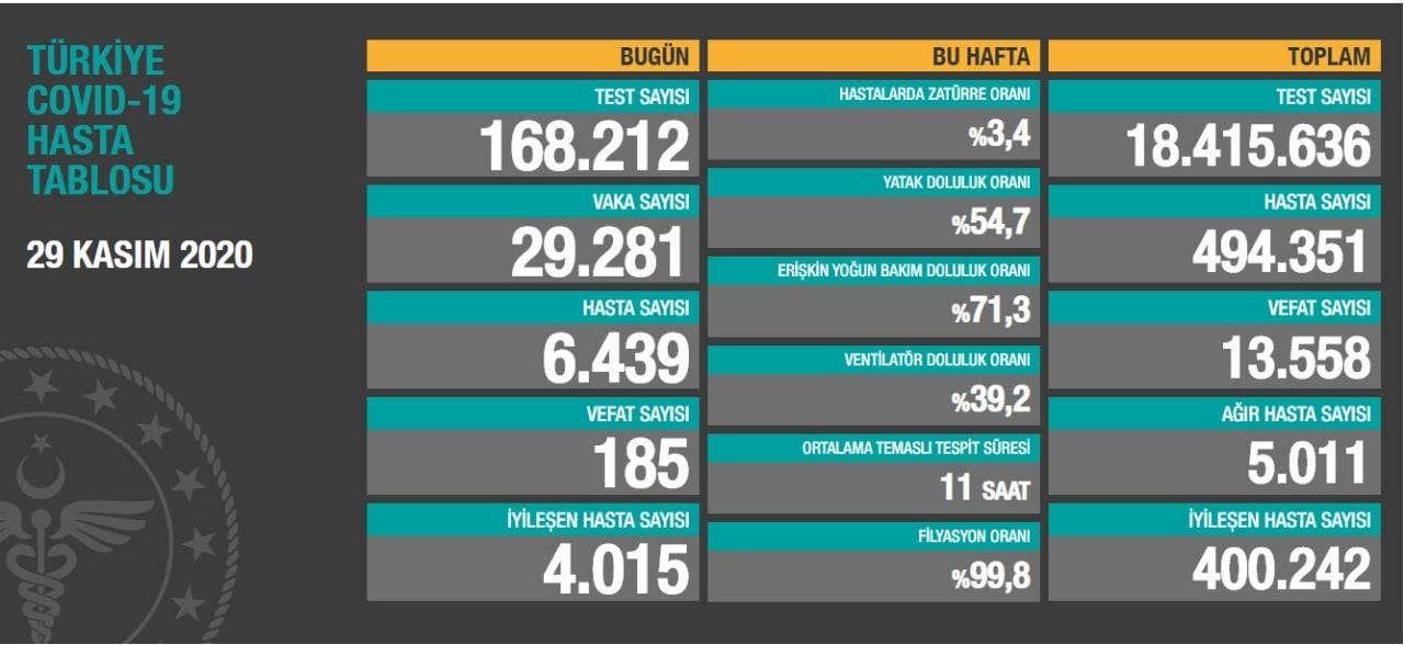 Bakan Koca, ‘Türkiye Günlük Koronavirüs Tablosu’nu açıkladı. Tabloya göre 29 Kasım tarihinde yapılan 168 bin 212 corona virüsü testinden 6.439’u pozitif çıktı, 185 kişi hayatını kaybetti, 4.015 hasta iyileşti. Tablodaki günlük toplam vaka sayısı ise 29.281 olarak açıklandı. Tabloda bugüne kadar yapılan toplam test sayısı 18 milyon 415 bin 636, toplam hasta sayısı 494 bin 351, toplam iyileşen hasta sayısı 400 bin 242 toplam vefat sayısı ise 13 bin 558 olarak yer aldı.